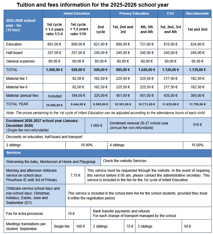 The scool reserves the right to modify the prices in the event of there being any changes to the current legislation as regards taxes or an unforeseen increase in the cost of the products or services provided by our suppliers. If you have any query or doubt, please contact the Administrative Secretary.