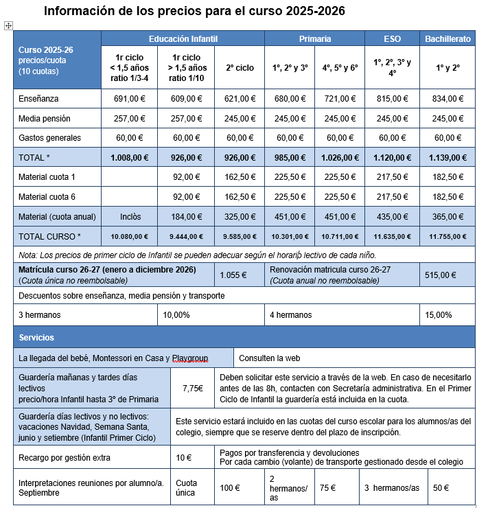 El colegio se reserva el derecho de modificar los precios en caso de que hubiera algún cambio en la legislación vigente en cuanto a los impuestos o un aumento imprevisto en los costes de los productos o servicios de nuestros proveedores. Para cualquier duda o consulta dirigirse a Secretaría Administrativa.
